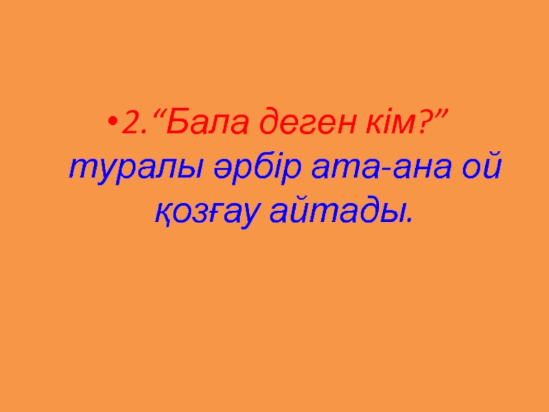 Слайд 82.“Бала деген кім?” туралы әрбір ата-ана ой қозғау айтады.