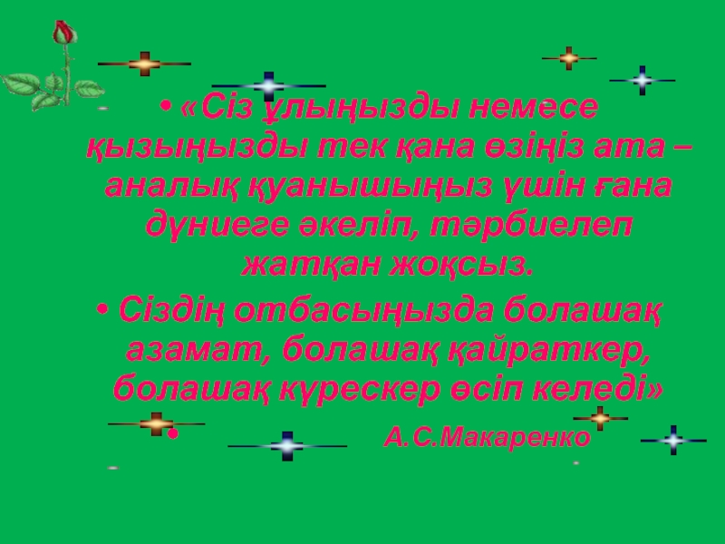 Слайд 4«Сіз ұлыңызды немесе қызыңызды тек қана өзіңіз ата – аналық қуанышыңыз