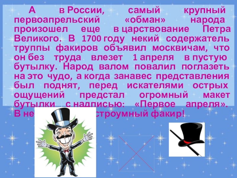 Великого. В 1700 году некий содержатель труппы факиров объявил москвичам, что он без труда влезет 1 апреля в пустую бутылку. Народ валом повалил поглазеть на это чудо, а когда занавес представления был поднят, перед искателями острых ощущений предстал огромный макет бутылки с надписью: «Первое апреля». В нее-то и влез остроумный факир!