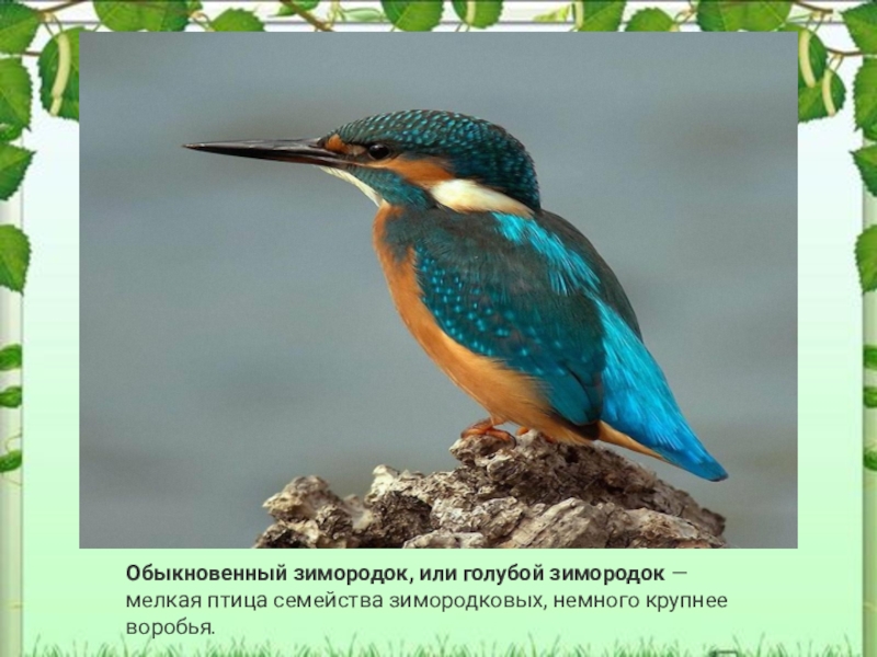 Обыкновенный зимородок, или голубой зимородок — мелкая птица семейства зимородковых, немного крупнее