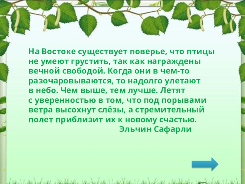 На Востоке существует поверье, что птицы не умеют грустить, так как награждены вечной свободой. Когда они в чем-то разочаровываются, то надолго улетают