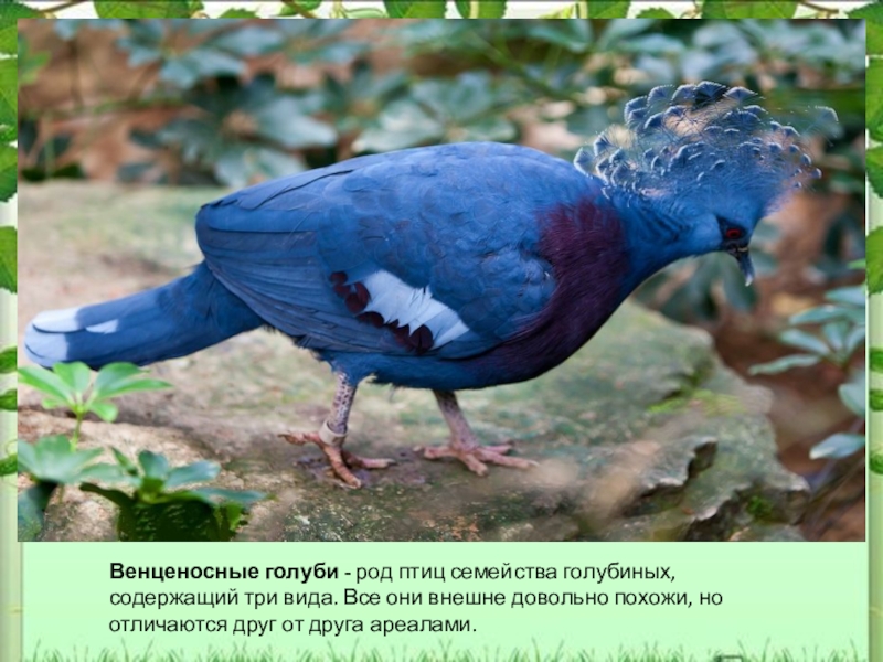 Венценосные голуби - род птиц семейства голубиных, содержащий три вида. Все они внешне довольно похожи, но