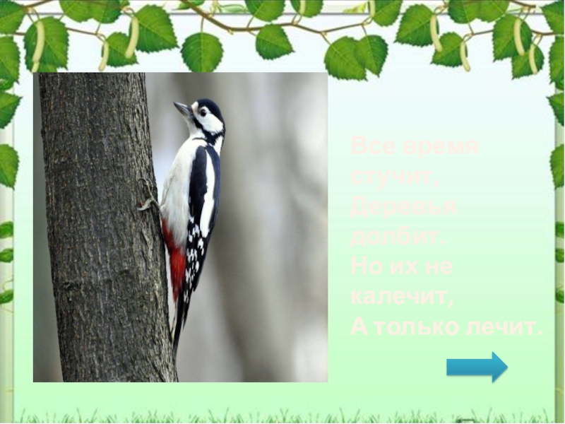 Все время стучит,Деревья долбит.Но их не калечит,А только лечит.
