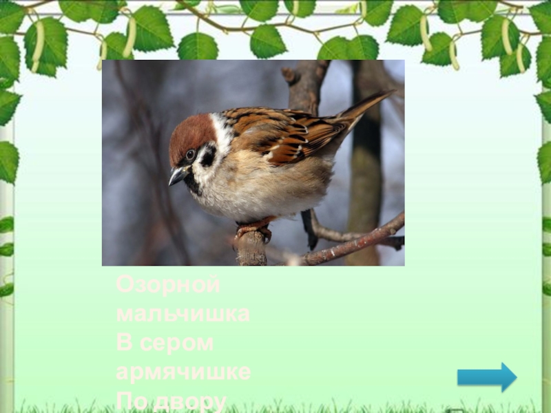 Озорной мальчишкаВ сером армячишкеПо двору шныряет,Крохи собирает.