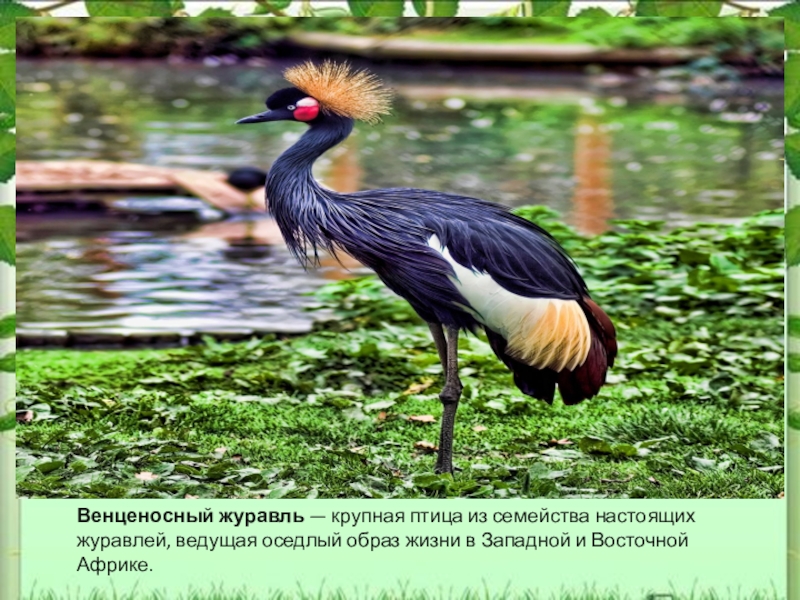 Венценосный журавль — крупная птица из семейства настоящих журавлей, ведущая оседлый образ жизни в Западной и Восточной