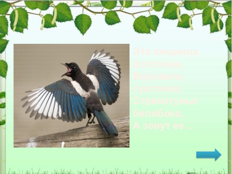 Эта хищница болтлива,Воровата, суетлива,Стрекотунья белобока,А зовут ее ...