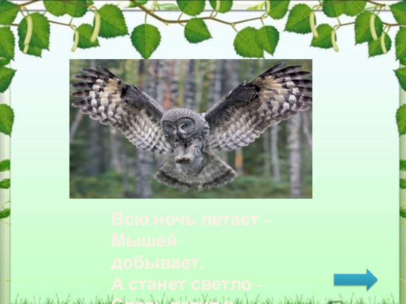 Всю ночь летает -Мышей добывает.А станет светло -Спать летит в дупло.