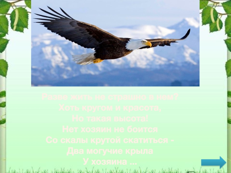 Разве жить не страшно в нем?Хоть кругом и красота,Но такая высота!Нет хозяин не боитсяСо скалы крутой скатиться