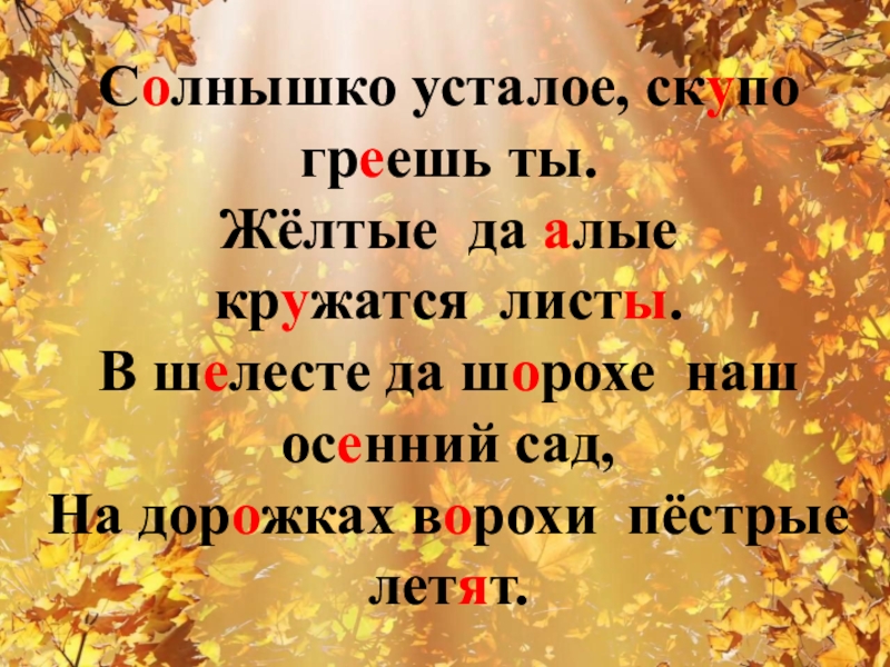 Солнышко усталое, скупо  греешь ты.Жёлтые  да алые  кружатся  листы.В шелесте да шорохе  наш осенний сад,На дорожках ворохи  пёстрые  летят.