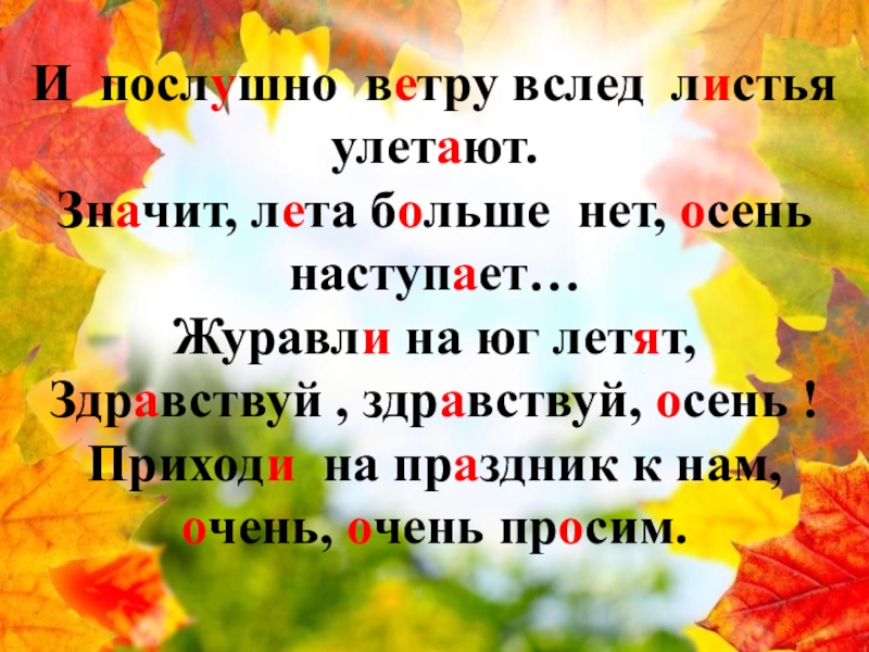 И  послушно  ветру вслед  листья улетают.Значит, лета больше  нет, осень  наступает…Журавли на юг летят,Здравствуй , здравствуй, осень
