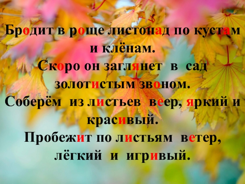Слайд 3Бродит в роще листопад по кустам и клёнам.