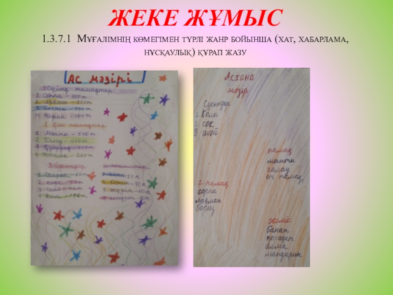 1.3.7.1 Мұғалімнің көмегімен түрлі жанр бойынша (хат, хабарлама,нұсқаулық) құрап жазу