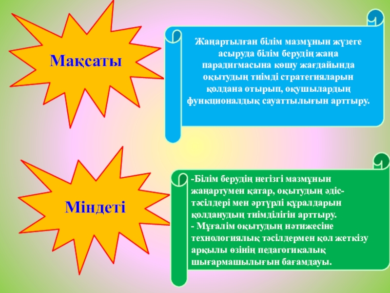 -Білім берудің негізгі мазмұнын жаңартумен қатар, оқытудың әдіс-тәсілдері мен әртүрлі құралдарын қолданудың тиімділігін арттыру.