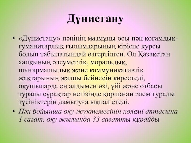 «Дүниетану» пәнінің мазмұны осы пән қоғамдық-гуманитарлық ғылымдарының кіріспе курсы болып