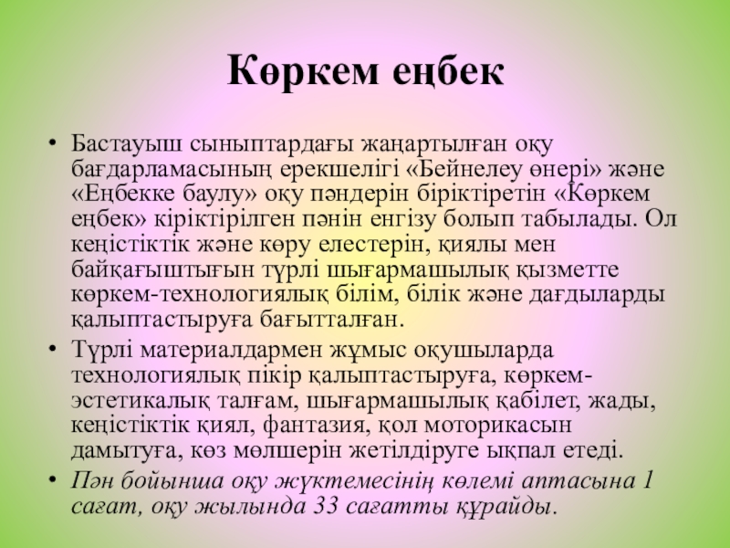 «Еңбекке баулу» оқу пәндерін біріктіретін «Көркем еңбек» кіріктірілген пәнін енгізу болып табылады. Ол кеңістіктік және көру елестерін, қиялы мен байқағыштығын түрлі шығармашылық қызметте көркем-технологиялық білім, білік және дағдыларды қалыптастыруға бағытталған.