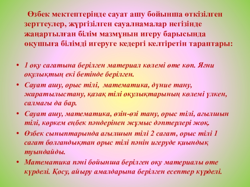 Өзбек сыныптарында ағылшын тілі 2 сағат, орыс тілі 1 сағат болғандықтан орыс тілі пәнін игеруде қиындық туындайды.