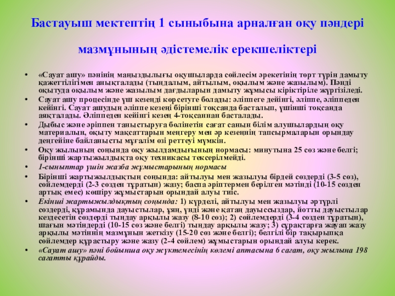 Слайд 19Бастауыш мектептің 1 сыныбына арналған оқу пәндері мазмұнының әдістемелік ерекшеліктері
