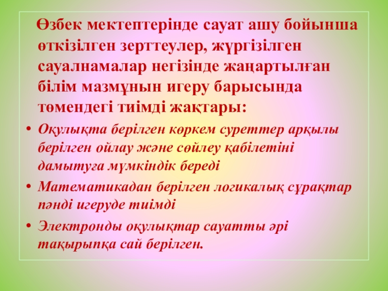 Слайд 31 Өзбек мектептерінде сауат ашу бойынша өткізілген зерттеулер, жүргізілген