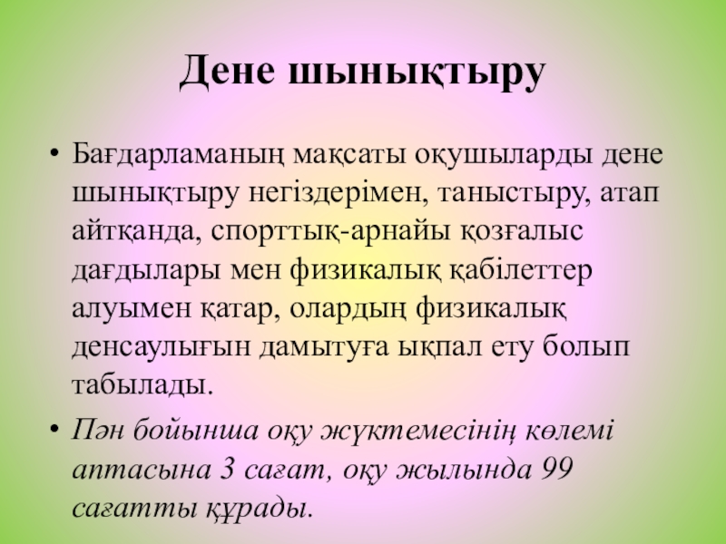 Бағдарламаның мақсаты оқушыларды дене шынықтыру негіздерімен, таныстыру, атап айтқанда,