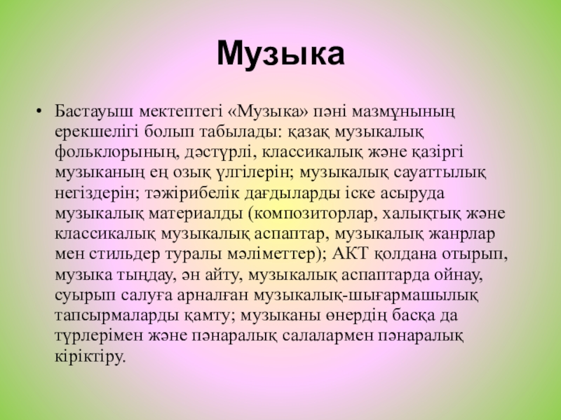 Бастауыш мектептегі «Музыка» пәні мазмұнының ерекшелігі болып табылады: қазақ музыкалық