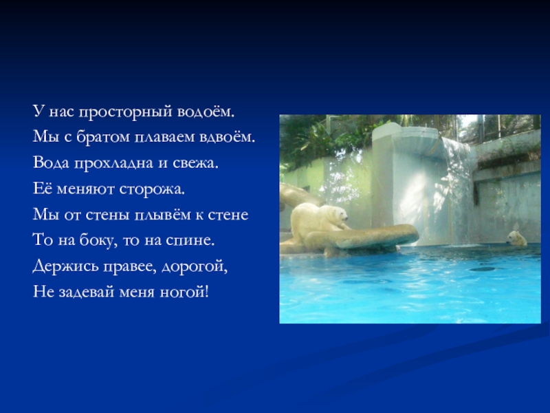 У нас просторный водоём.Мы с братом плаваем вдвоём.Вода прохладна и свежа.Её меняют сторожа.Мы от стены плывём к