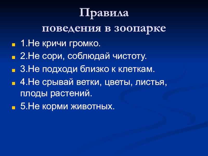 Правила  поведения в зоопарке1.Не кричи громко.2.Не сори, соблюдай чистоту.3.Не подходи близко к клеткам.4.Не срывай ветки, цветы,