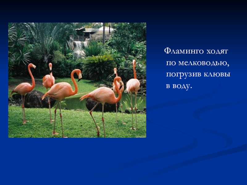 Фламинго ходят по мелководью, погрузив клювы в воду.