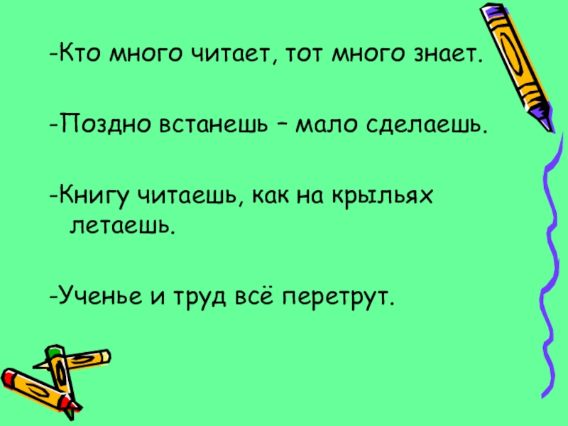 -Кто много читает, тот много знает.-Поздно встанешь – мало сделаешь.-Книгу читаешь, как на крыльях летаешь.-Ученье и труд