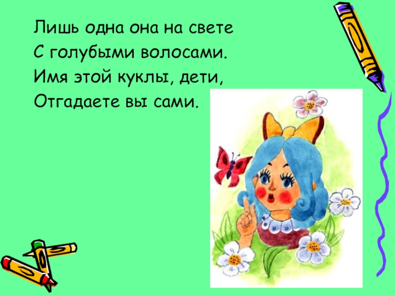 Лишь одна она на светеС голубыми волосами.Имя этой куклы, дети,Отгадаете вы сами.