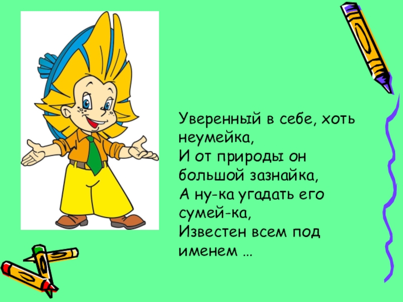 Уверенный в себе, хоть неумейка, И от природы он большой зазнайка, А ну-ка угадать его сумей-ка, Известен