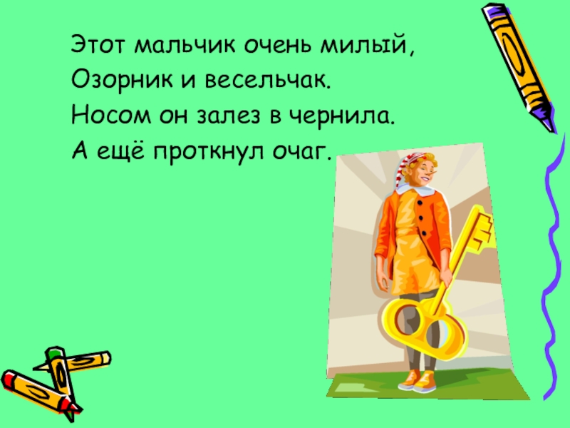 Этот мальчик очень милый,  Озорник и весельчак.  Носом он залез в чернила.