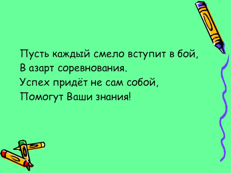 Пусть каждый смело вступит в бой, В азарт соревнования.Успех придёт не сам собой, Помогут Ваши знания!