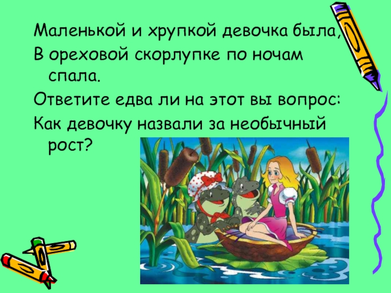 Маленькой и хрупкой девочка была,В ореховой скорлупке по ночам спала.Ответите едва ли на этот вы вопрос:Как девочку
