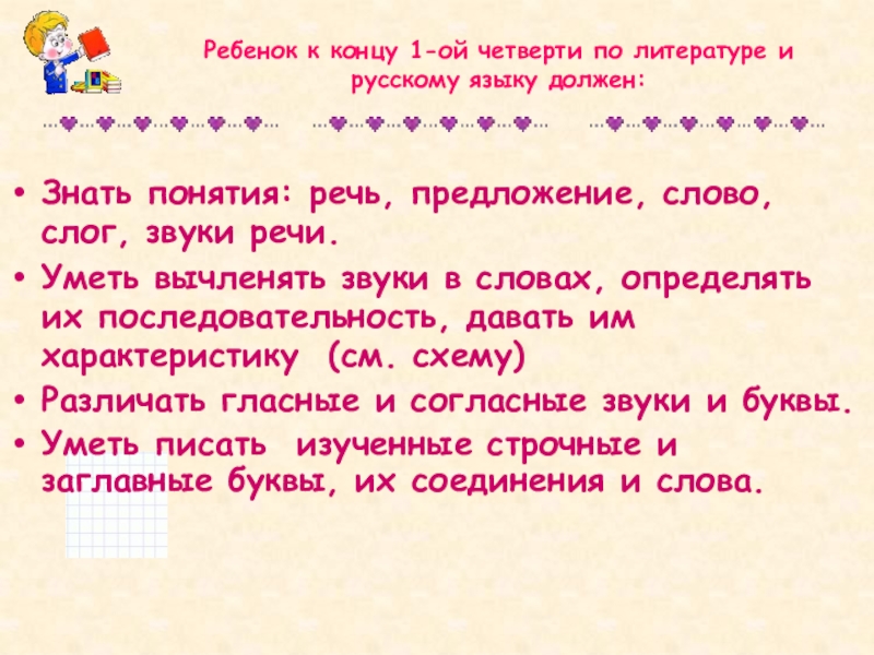 Знать понятия: речь, предложение, слово, слог, звуки речи.