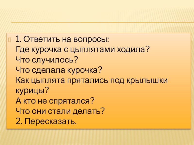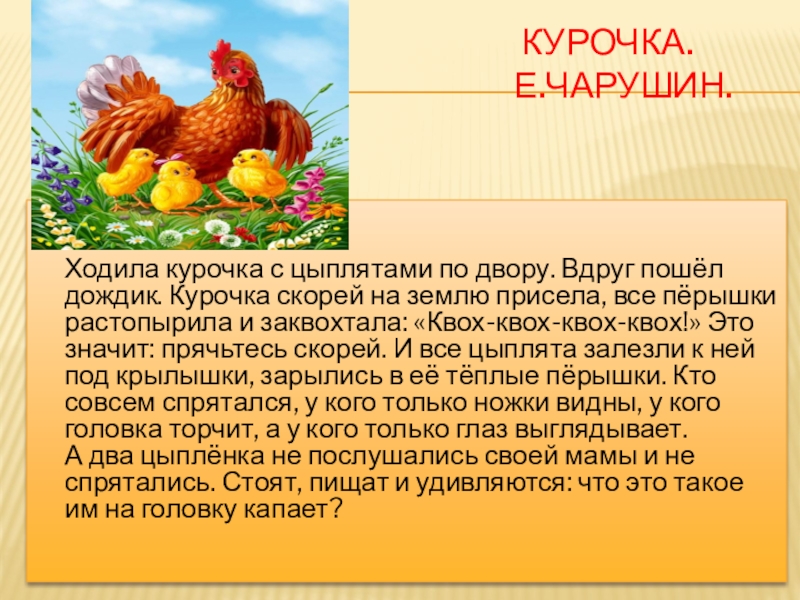Ходила курочка с цыплятами по двору. Вдруг пошёл дождик. Курочка скорей