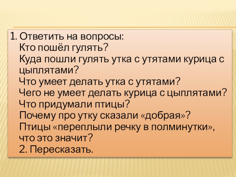 к речке пришли. Утка с утятами умеют плавать, а курица с цыплятами не умеют. Что делать? Думали- думали и придумали! Речку переплыли ровно в полминутки: цыплёнок на утёнке, цыплёнок на утёнке, а курица на утке!