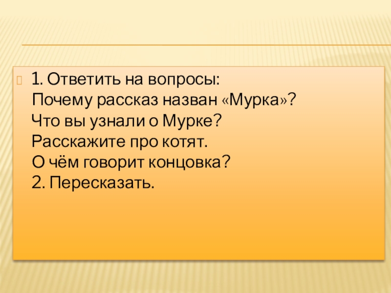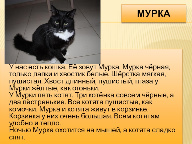 У нас есть кошка. Её зовут Мурка. Мурка чёрная, только лапки
