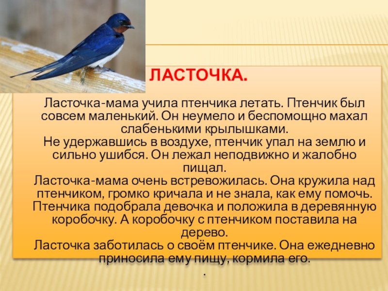 Кот бросился за ней, но ласточка проворно увернулась, а кот промахнулся и со всего размаха хлопнулся на землю. Вскоре птенчик совсем выздоровел и ласточка с радостным щебетанием увела его в родное гнездо под соседней крышей