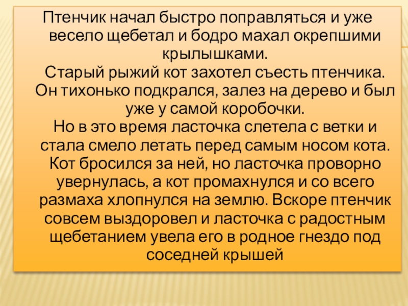 Слайд 11Птенчик начал быстро поправляться и уже весело щебетал и бодро махал