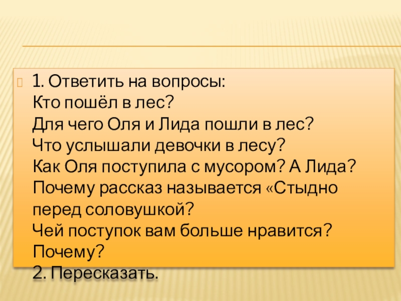 Вынули из сумки хлеб, масло, яйца. Когда девочки уже закончили обед, недалеко от них запел соловей. Очарованные прекрасной песней, Оля и Лида сидели, боясь пошевельнуться.