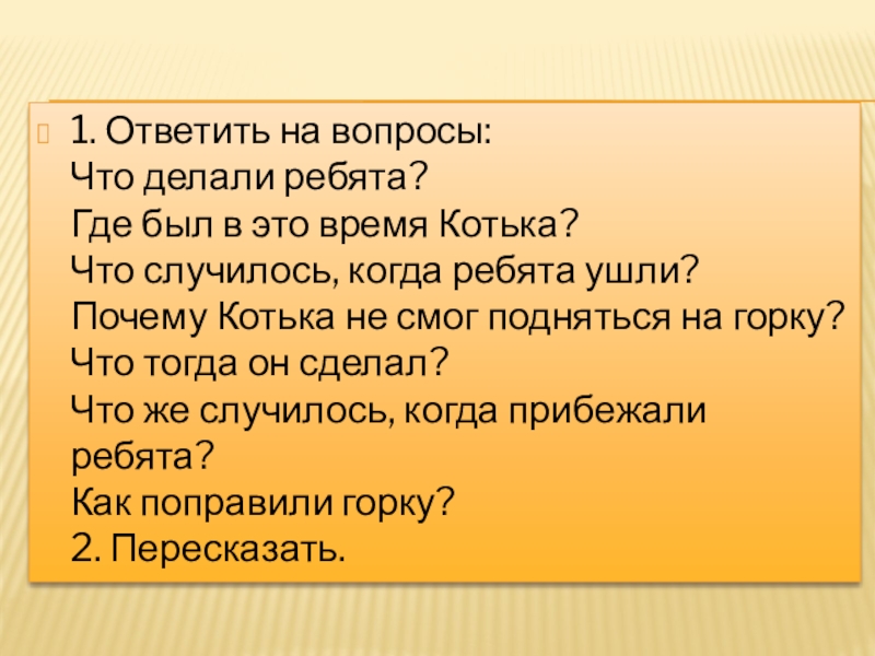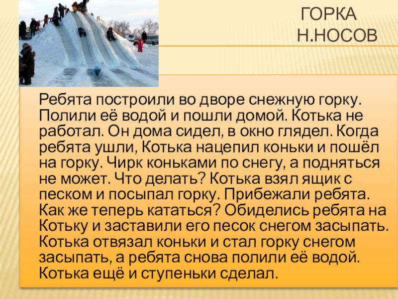 домой. Котька не работал. Он дома сидел, в окно глядел. Когда ребята ушли, Котька нацепил коньки и пошёл на горку. Чирк коньками по снегу, а подняться не может. Что делать? Котька взял ящик с песком и посыпал горку. Прибежали ребята. Как же теперь кататься? Обиделись ребята на Котьку и заставили его песок снегом засыпать. Котька отвязал коньки и стал горку снегом засыпать, а ребята снова полили её водой. Котька ещё и ступеньки сделал.