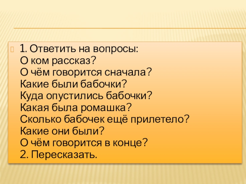 жёлтая, другая коричневая с красными пятнышками, а третья бабочка была голубая. Опустились бабочки на большую красивую ромашку. Тут прилетели ещё две разноцветные бабочки и сели на ту же ромашку