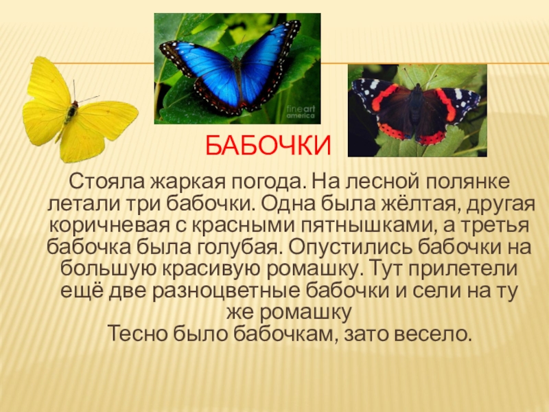 Стояла жаркая погода. На лесной полянке летали три бабочки. Одна была