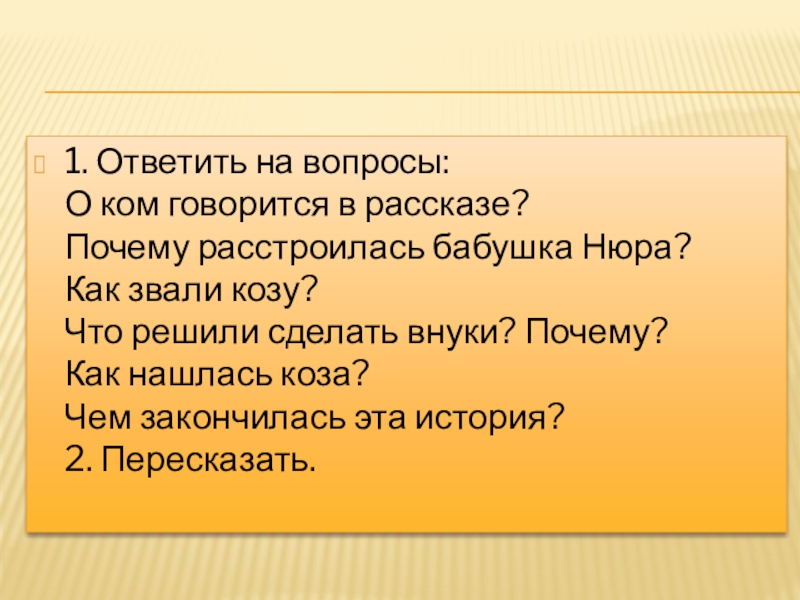 У бабушки Нюры пропала коза Ночка. Бабушка сильно расстроилась.