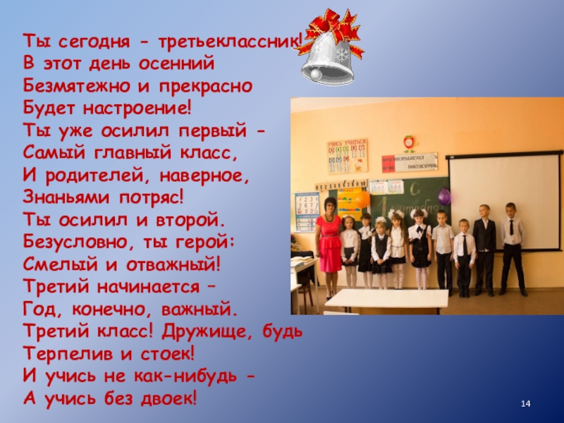 Ты осилил и второй. Безусловно, ты герой: Смелый и отважный! Третий начинается – Год, конечно, важный. Третий класс! Дружище, будь Терпелив и стоек! И учись не как-нибудь - А учись без двоек!