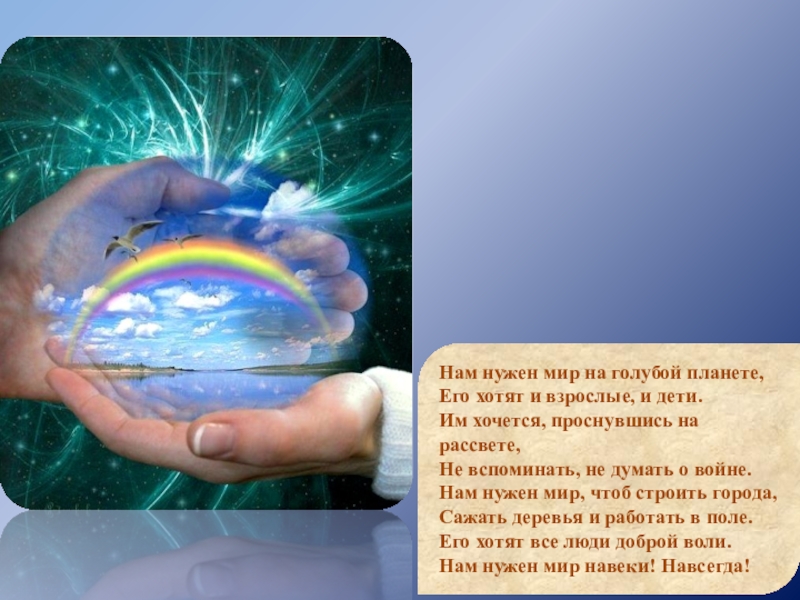 Нам нужен мир на голубой планете, Его хотят и взрослые, и дети.  Им хочется, проснувшись на