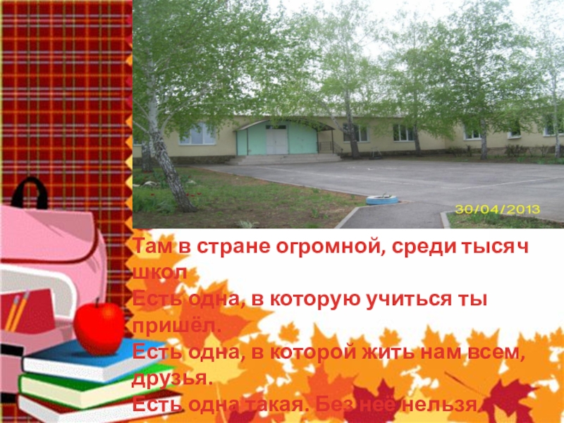 Там в стране огромной, среди тысяч школЕсть одна, в которую учиться ты пришёл.Есть одна, в которой жить нам всем, друзья.Есть одна такая. Без неё нельзя.МБОУ Тихо-Журавская ООШ