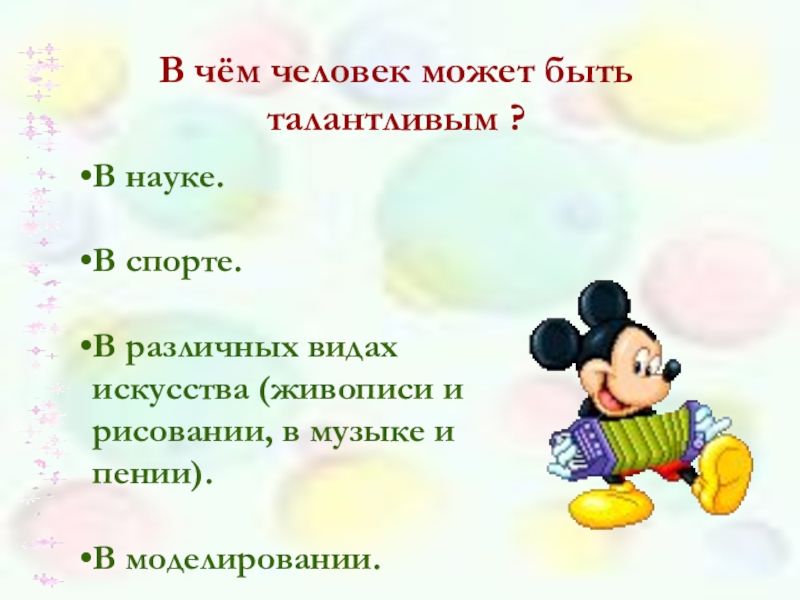 В различных видах искусства (живописи и рисовании, в музыке и пении).