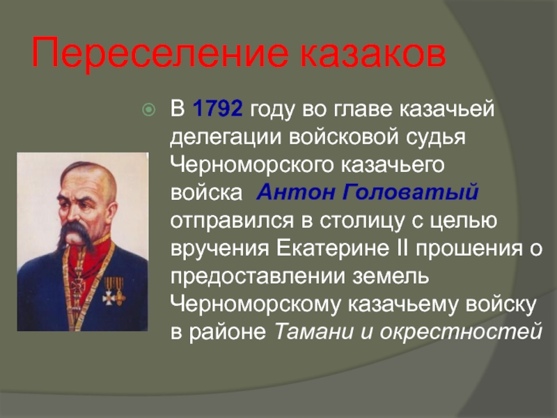 Переселение казаковВ 1792 году во главе казачьей делегации войсковой судья Черноморского казачьего войска  Антон Головатый отправился в