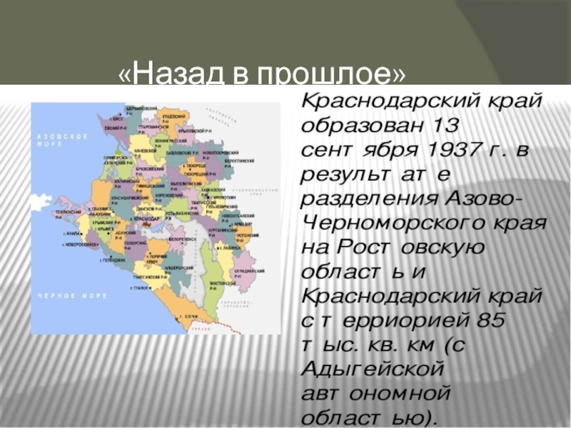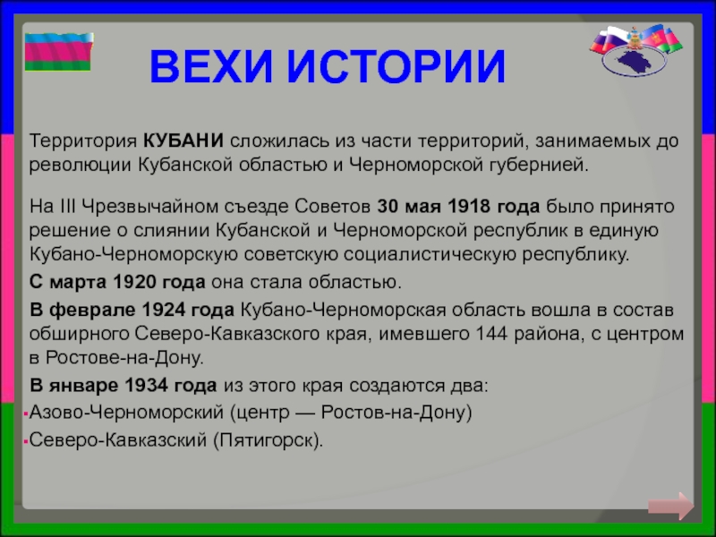 ВЕХИ ИСТОРИИТерритория КУБАНИ сложилась из части территорий, занимаемых до революции Кубанской областью и Черноморской губернией. На III